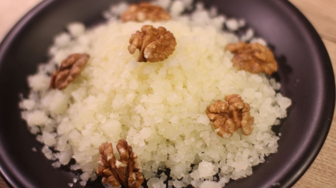 Kada se masa pretvorila u mrvice izvaditi i servirati u prigodne zdjelice, posuti sa sjeckanim orasima ili nekm drugim orašastim plodovima.