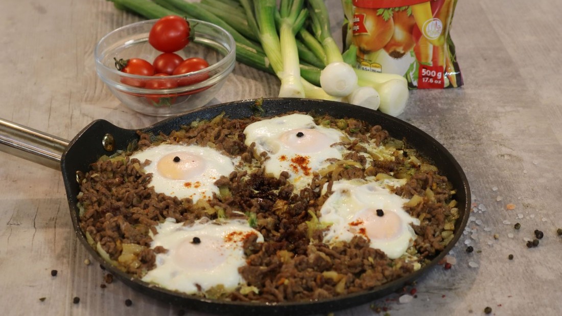 Na maslacu i ulju prodinstati crveni luk, dodati mljeveno meso, posoliti, pobiberiti i dodati Tajna zači, pa sve dinstati. Kada je meso gotovo rasporediti ga na tavi i izliti jaja na meso. Posoliti i pobiberiti jaja, poklopiti i zapeći da se jaja ispeku.