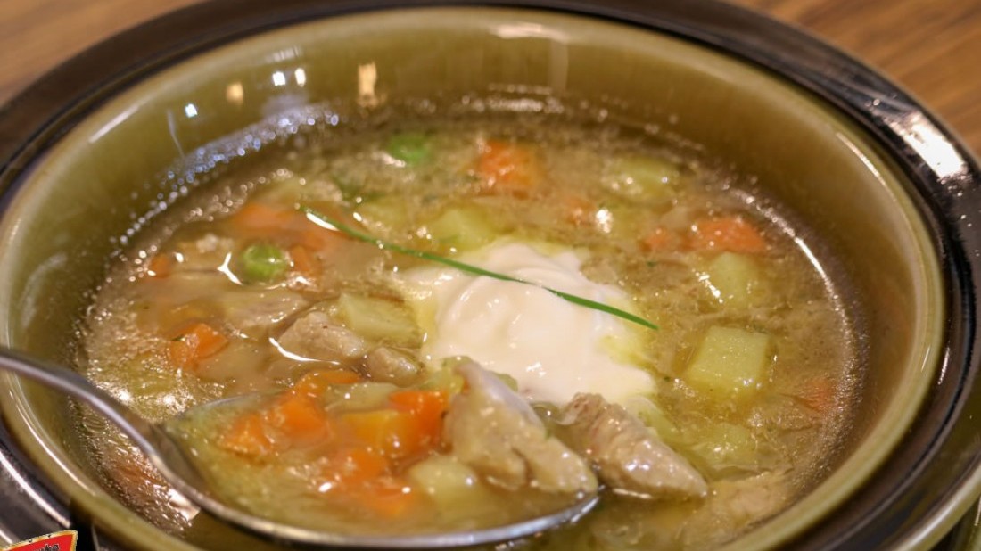U šerpu staviti ulje i maslac, zatim dodati crveni i bijeli luk, pa dinstati kratko da luk porumeni, zatim dodati meso, dinstati tri-četiri minute dok meso ne porumeni, zatim dodati mrkvu i celer i Tajna začin, biber i sol. Zaliti sa vodom. Dodati peršunov list i list lovora. Kuhati na laganoj vatri oko 30 minuta, dodati grašak i kuhati još oko 15 minuta.
