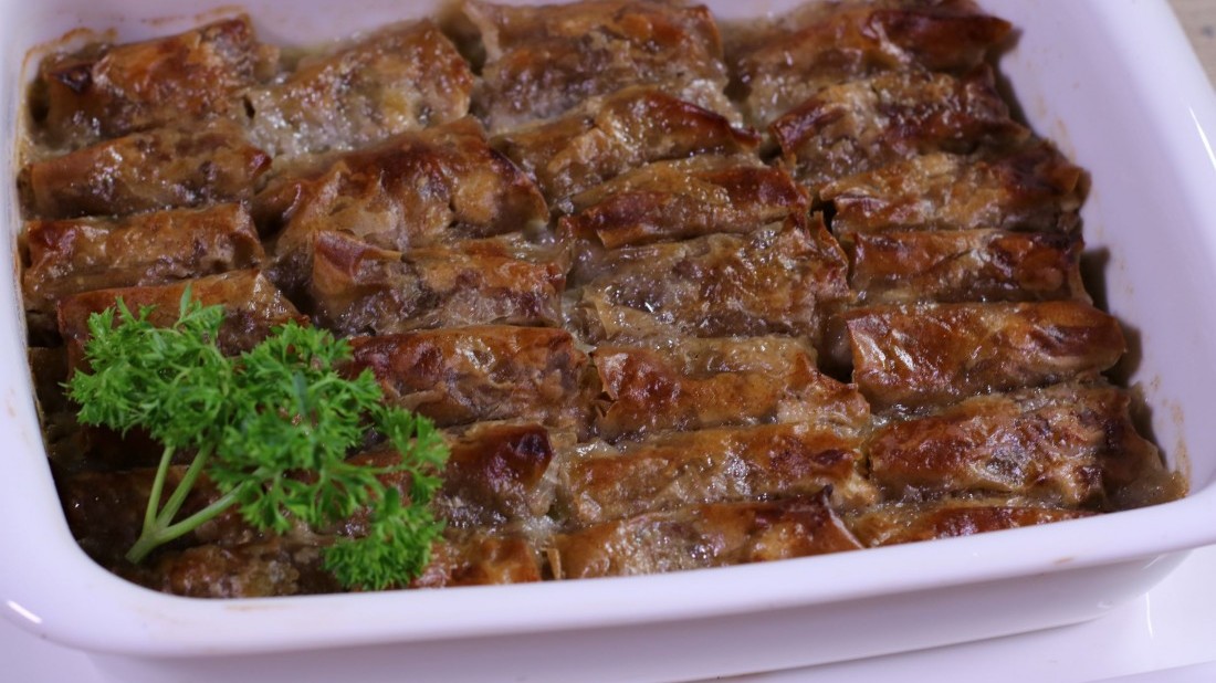 Jufku razviti, malo posušiti i isjeći na kvaratće 15x15cm. Na sredinu kvadratića jufke staviti pripremljeni fil, zarolati i redati u namšćenu tepsiju. Peći na 200 stepeni oko 25 minuta.
